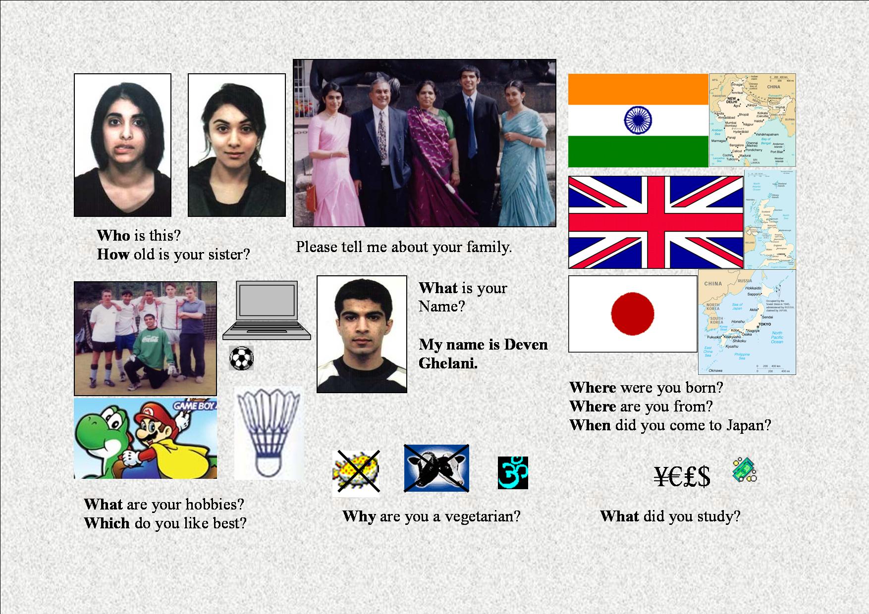 When I first came to Japan, I had to introduce myself to 50 different classes of students who all had the same questions and were interested in the same things. So this page is basically my introduction lesson typed up. There is a lot more to me than this, but I like to keep things simple. So, Hello Everyone, My name is Deven Ghelani, I am 21 years old and come from England. I wasn't born in England though, I was born in India. I came from India to England when I was four years old. Now I'm in Japan. Here is a picture of my family. My father is a manager, and my mother is a nurse. I have two sisters. My big sister is 26 years old. My other sister and I are twins. My hobbies are football and video games. This is a picture of my football team in England called the Bobsters. I like all sports, I also like teaching English and studying Japanese. I am a vegetarian because of my religion, I am a Hindu. I studied Economics at Nottingham University. |