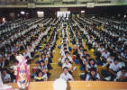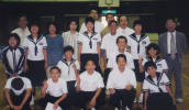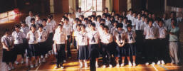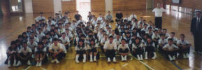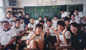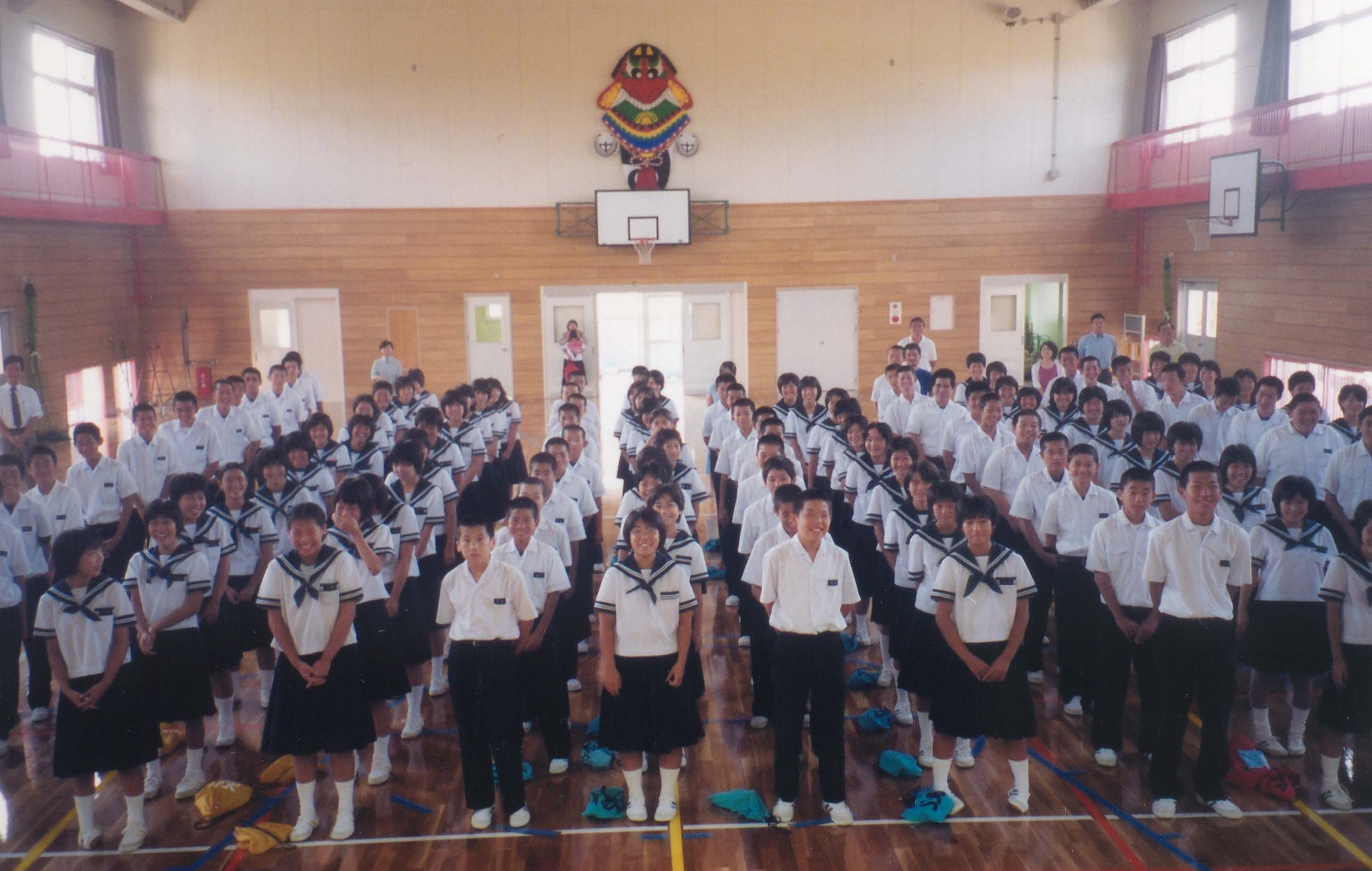 Photo Album - SchoolsThis is my biggest school. I am giving my introduction speech in Japanese to hundreds of students. I am bricking it! If I ever wonder why I am here doing this job, I just look at this photo. Check out their faces. This school has an excellent atmosphere. All of the students are really friendly. They put on an excellent culture festival, where they parodied the film 'Waterboys' and there's a girl here who plays the Shamisen like Jimi Hendrix. Sakiyama JHS The kids here are really into singing. It also has the best view of the island, with the sea on one side and the volcano on the other.